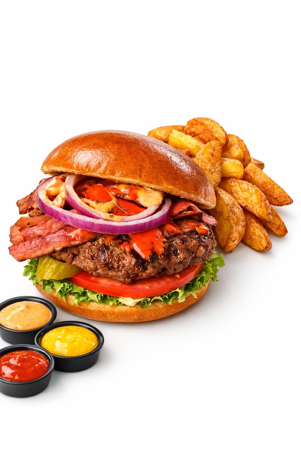 160 غرام لحم , صلصة نيويورك، بصل أحمر، خس, بندورة, خيار مخللاضافات: حلقات بصل -10₪بصل مكرمل 5₪الفلفل هالبينو 5₪فطر مكرمل 7₪جبنة شيدر 7₪بيضة عين 8₪مربى بصل 8₪جبنة جاودا اطعمة 10₪شرائح كورنبيف  12₪ شرائح اسادو  12₪شرائح انتركوت 14₪شرائح اوز 15₪