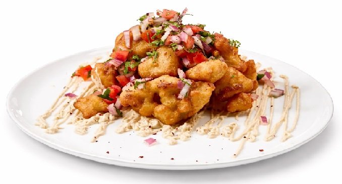 زهرة مقليه  على طبقة من الطحينية، فوقها  سلطة البيت،بندورة مفرومة، بصل مفروم، وبقدونس .